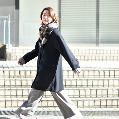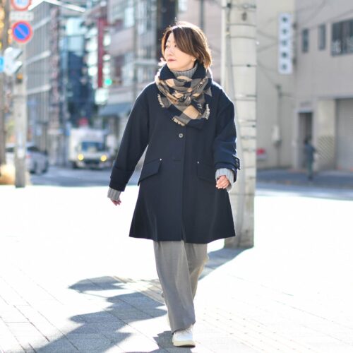 フンワリ軽いカシミヤストールをキュッと首元にプラスし