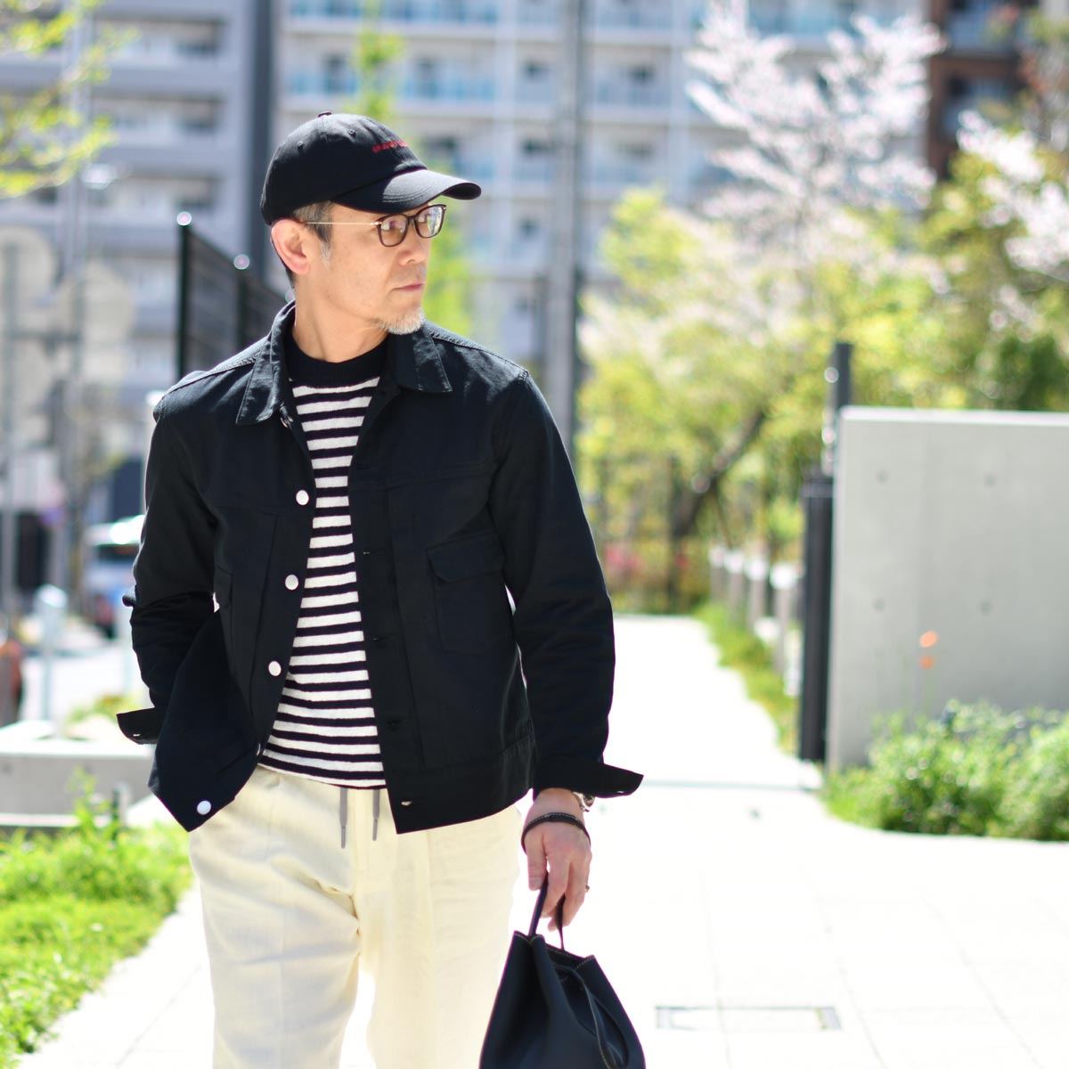 また、定番のデニム素材よりも軽いオンスのコットンツイルですから、着心地が柔らかく
