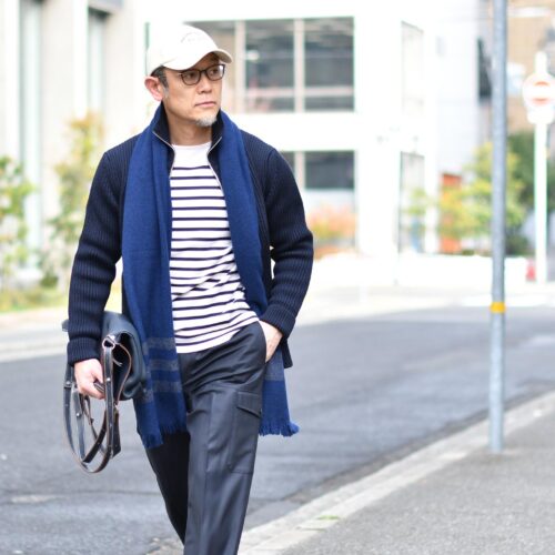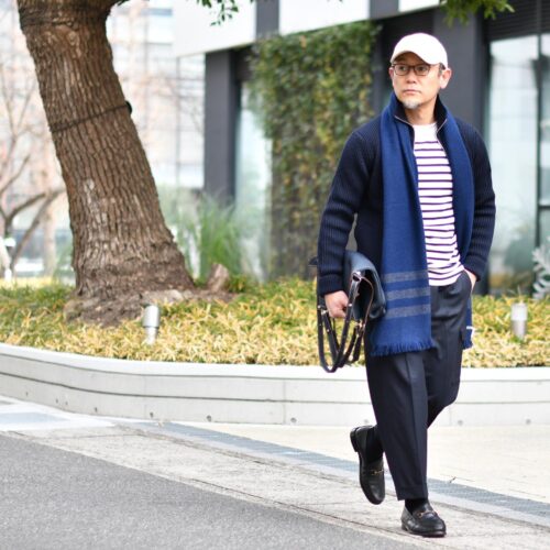 インナーにはJOHN SMEDLEYのマリンボーダーを合わせて、