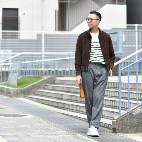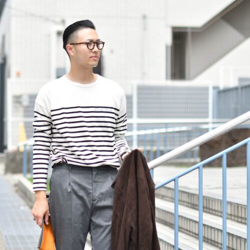 インナーのマリンボーダーや足元のスニーカーで外したスタイリングです。
