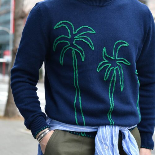 袖先や裾のリブ部分にも細やかな刺繍が施されたデザインは