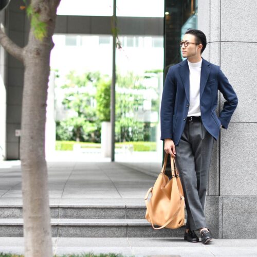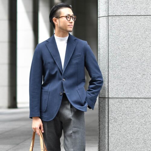 生地の表情が豊かで定番的なネイビージャケット合わせも奥行きのあるコーディネートに見えると思います。