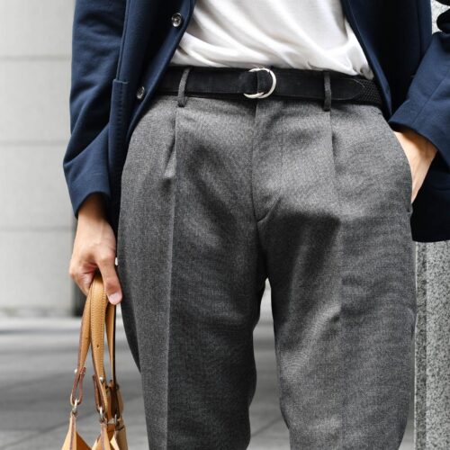 やや細身のテーパードパシルエットに、1Pを入れ腰まわりにほんの少し余裕を持たせています。