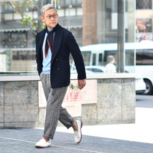 しなやかに動きのあるソフトな表情は、本来クラシカルなダブルブレストでも