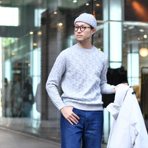 アイスグレーの都会的なカラーを活かしてニット、ニットキャップは同系色をチョイス。