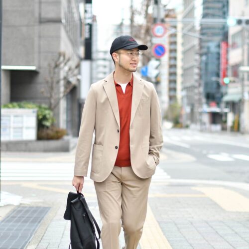 濃い目のベージュも相まって、ガシっとした質感のコットンスーツのように見えますが、