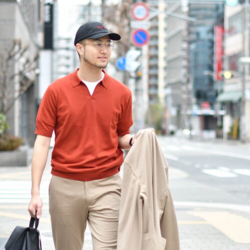 キャップや、スキッパーニットポロ、すにいーかーを合わせ、
