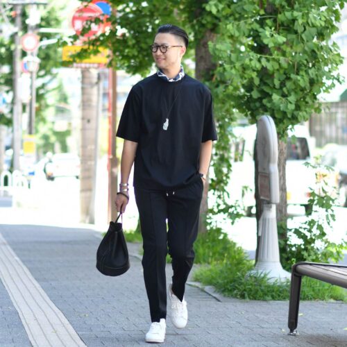夏の黒をスポーティにスタイリングしたコーディネート。
