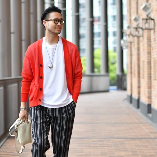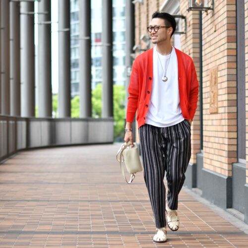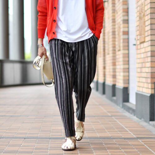 パンツは少しリゾートも感じさせるようなランダムストライプパンツ。