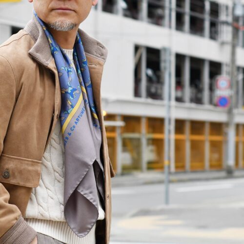 最後は90サイズのスカーフは鮮やかなブルーで少しアクセントをプラスして完成です!