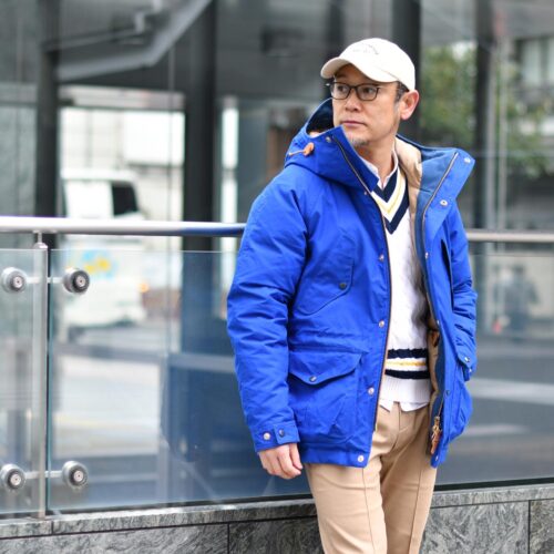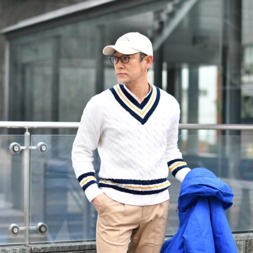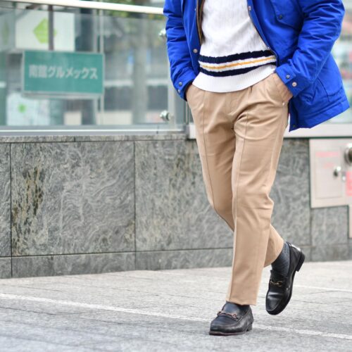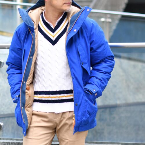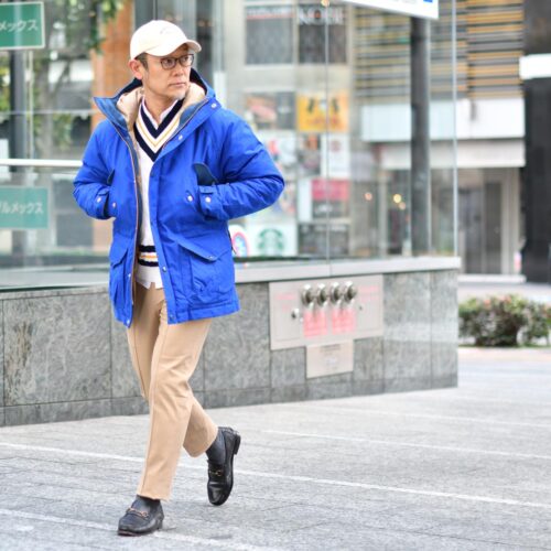 カラフルなブルーに、チルデンニットをインして、コットンチノをコーディネートして