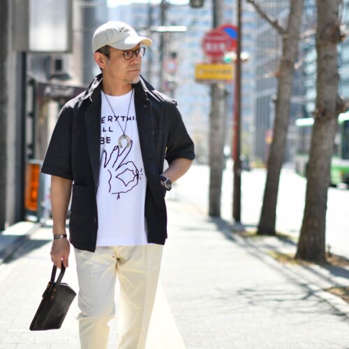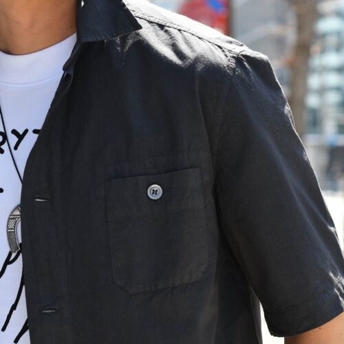 半袖のシャツ仕立てで軽やかな一着は、真夏の暑さでもTシャツ一枚着にならずに