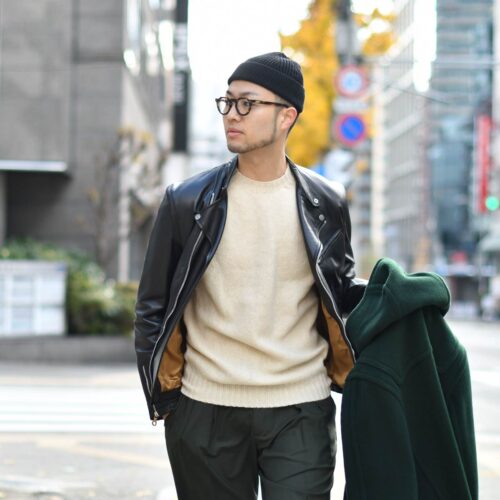 男前なレザーブルゾンをレイヤードさせて武骨さとセクシーさをプラス。