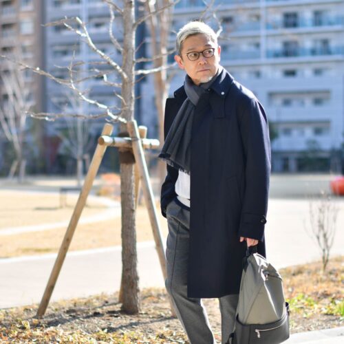 これぞスタンダードと言えるネイビーのステンカラーコートを使って