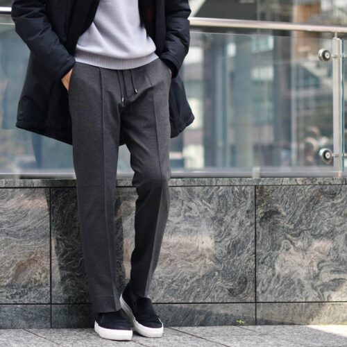 グレー系のニット、パンツを合わせて都会的なスポーツコーデをお楽しみください。