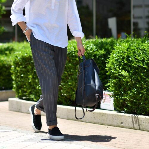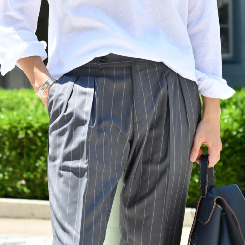 サマーウールのパンツは珍しいマットなグレーにストライプ。