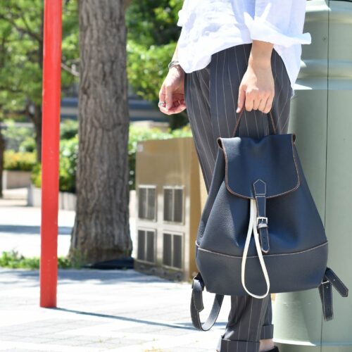 ネイビーのリュックにホワイトの紐を使った上品なコンビアイテムです☆