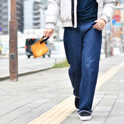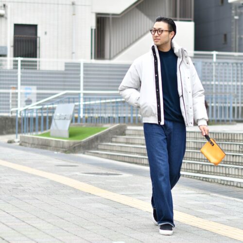 緩やかなシルエットのアウターに相性のいいCellar Door【セラードアー】のワイドデニムをチョイス。