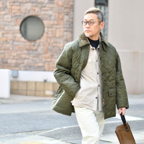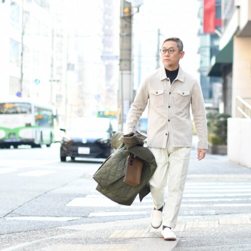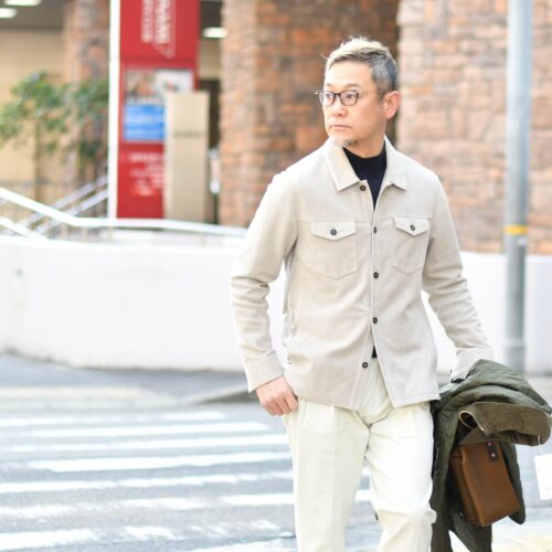 本日ご紹介致しますのは、ライトベージュのスエードレザーを使用したコーディネートのご紹介。