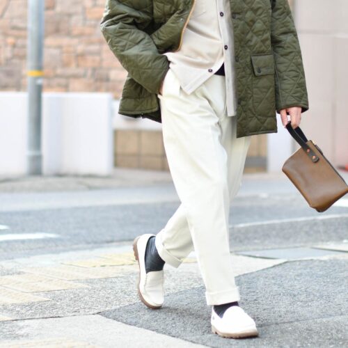 ボトムスはオフホワイトでレザーと少しグラデーションさせたカラーリング。