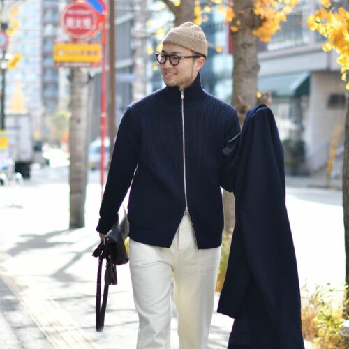 ネイビーのANDERSEN-ANDERSEN【アンデルセン・アンデルセン】のジップニットをレイヤードし、