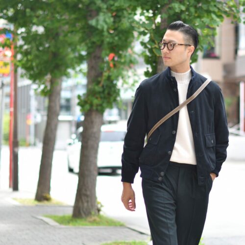 ネイビーシックなレザースタイル。