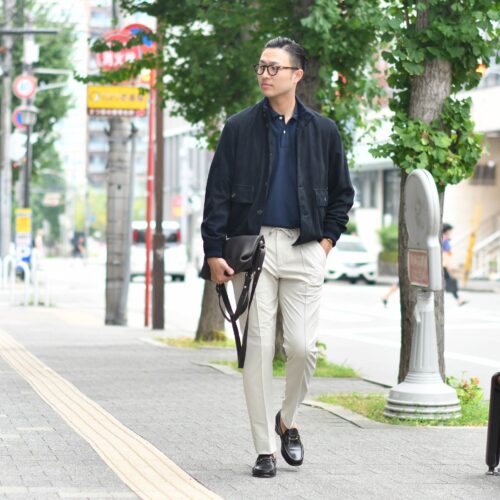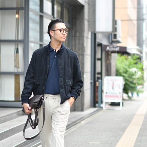 CINQUANTA【チンクアンタ】のドライビングブルゾンのネイビーを着用。