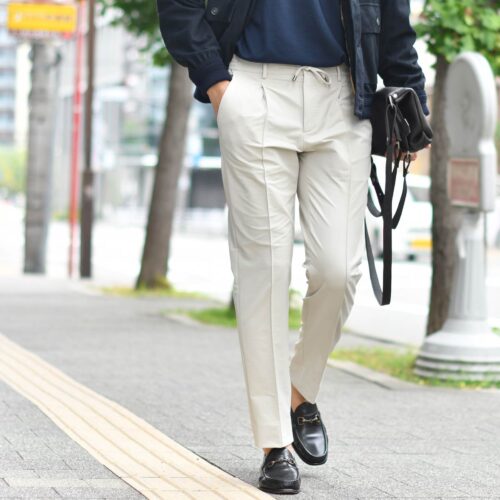 色の特徴を生かし、ライトベージュのパンツを履いて