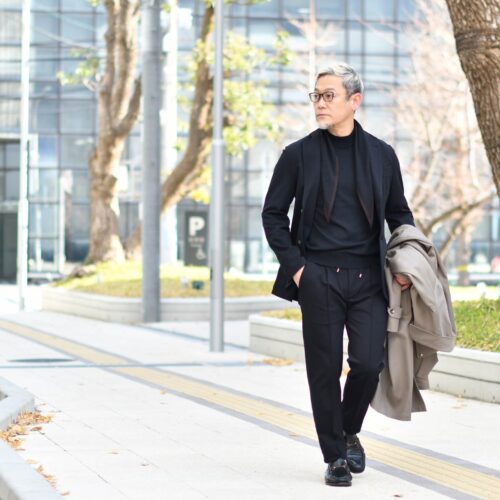 まるでカーディガンの様な快適な着心地で、見た目はクールなセットアップスタイルを