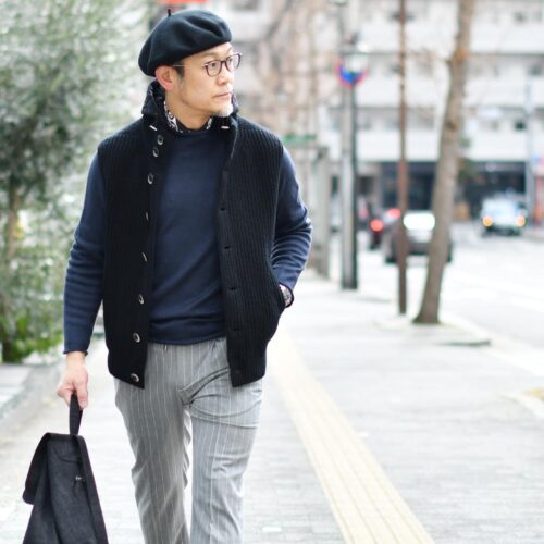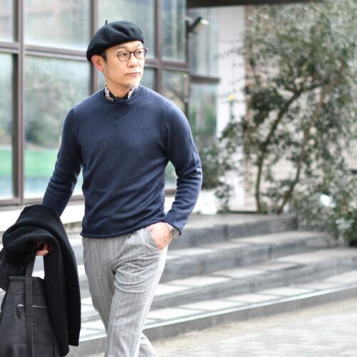 パンツはペンシルストライプ入りのグレーパンツで艶感を。