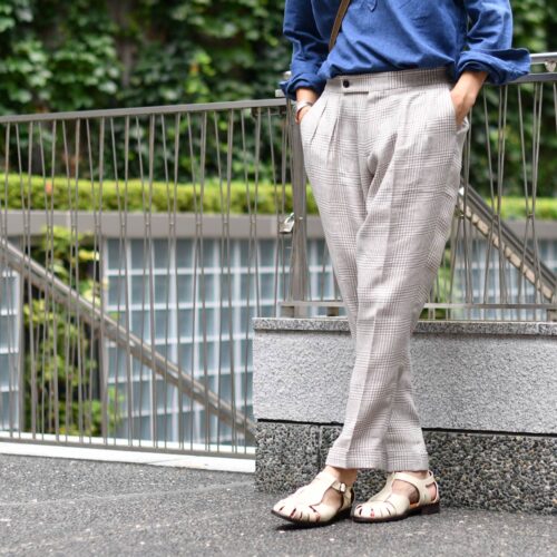 プリーツ入りで、持ち出しアリのスラックスが映えるので