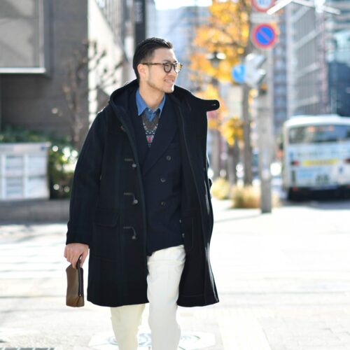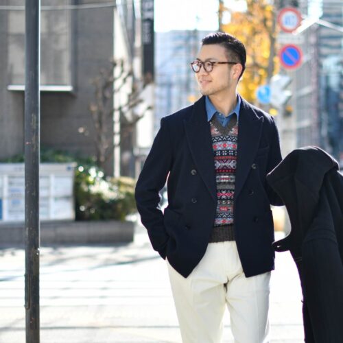 ジャケットのインナーはフェアアイルニットでプレッピーに。