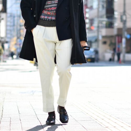 定番のネイビージャケットに合わせたのはテニスっぽくホワイトコットンスラックス。