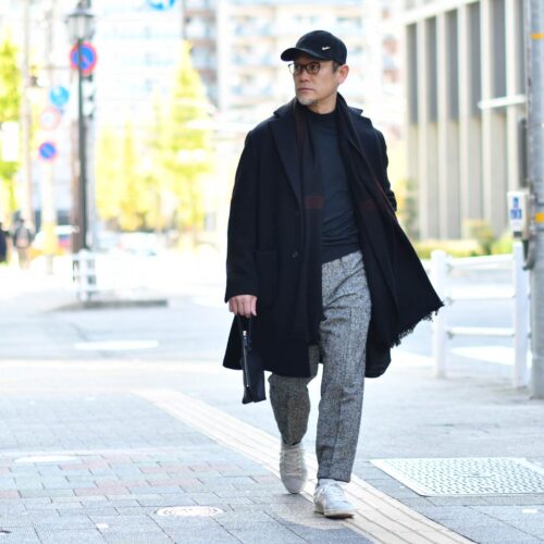 パンツは表情豊かなツイードヘリンボーンをチョイスして動きのあるスタイリングにしています☆