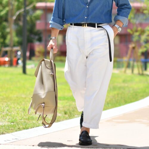 Cellar Door【セラードアー】のホワイトパンツに、ここはスニーカーではなく