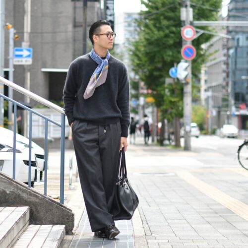 クルーネックニットを使用したコーディネートをご紹介いたします。