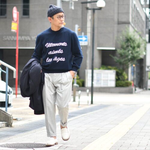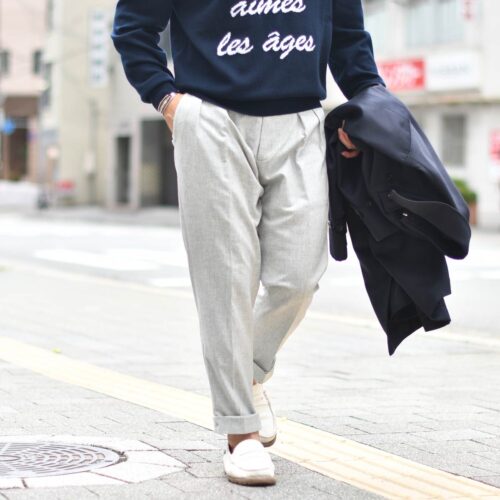 ネイビーのトップスには、柔らかな印象のライトグレーのパンツがエレガントに決まります。