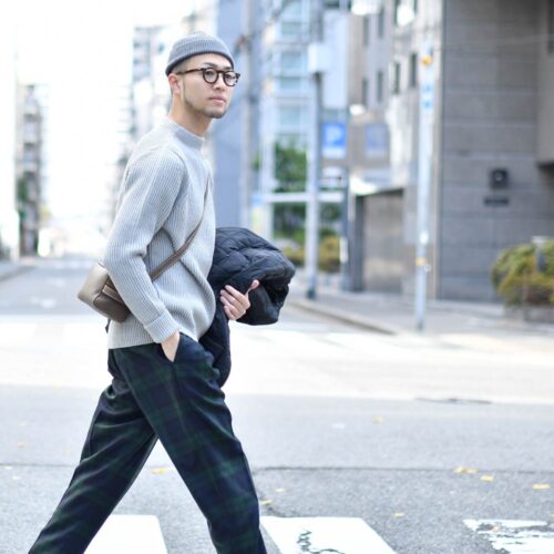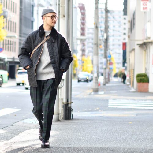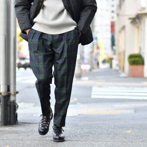 パンツは硬派なブラックウォッチ柄をチョイス。