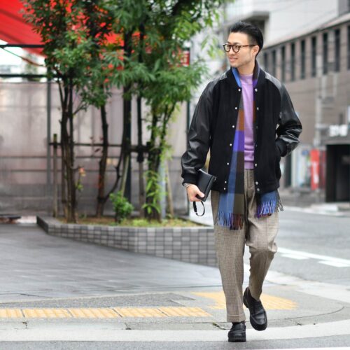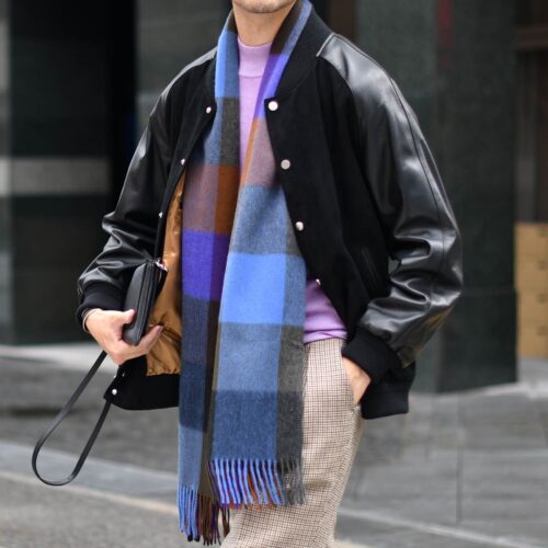 パンツ、ストールにチェック柄のアイテムをチョイスして存在感のあるコーディネートにしております。