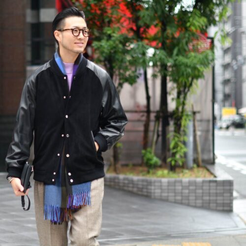 本日ご紹介致しますのはアソビゴコロのあるスタジャンコーデ。