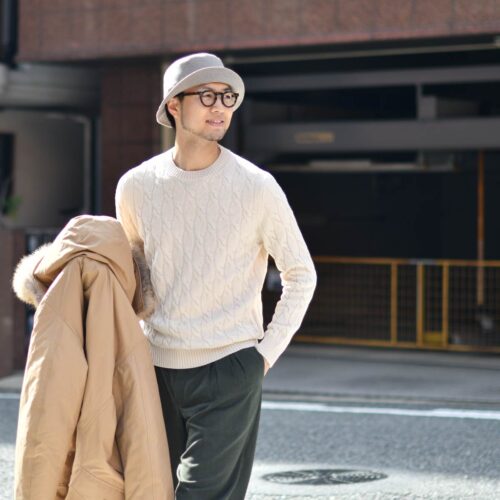 インナーに明るめのベージュ、パンツにカーキ系を合わせて統一感のあるカラーリングです。