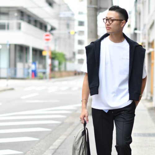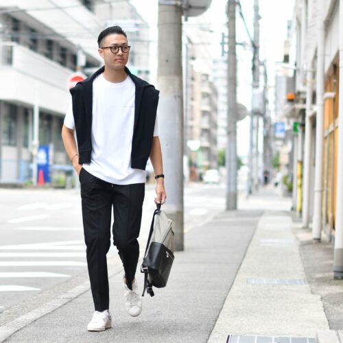白のスニーカーを履けば、休日のモノトーンスポーツスタイルが完成。