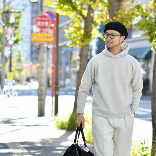 インナーもスウェットではなく、ニットパーカーを使用しています。