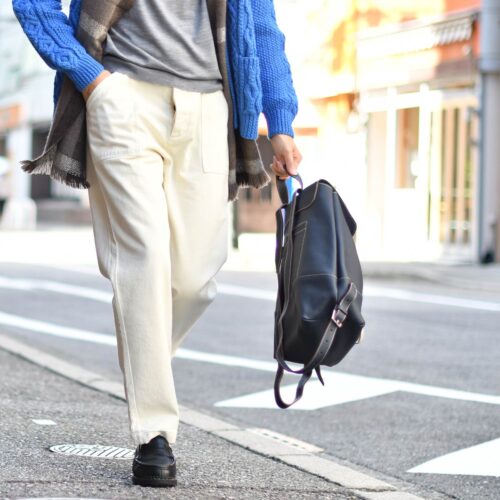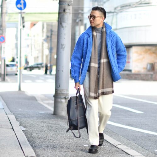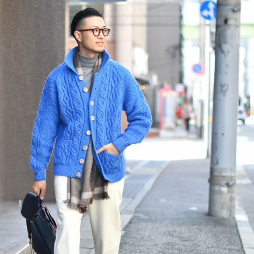 本日ご紹介致しますのはブルーのカーディガンを使用したコーディネート。