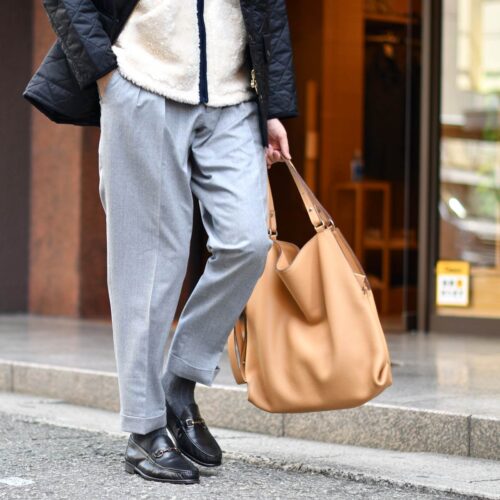 ニット、パンツ共にライトグレーでモノトーンでシンプルにまとめていますので、