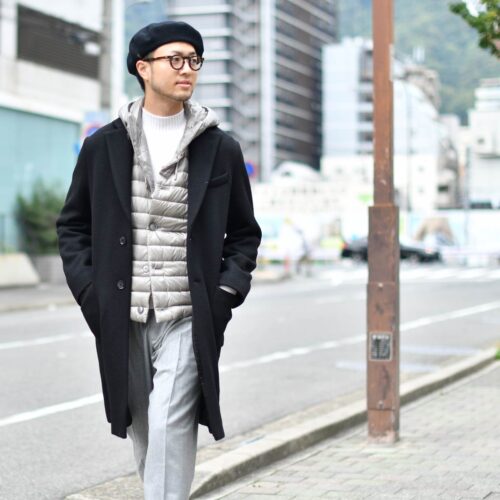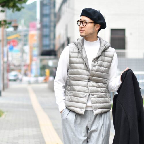 HERNO【ヘルノ】のダウンベストをインナーに使用したレイヤードスタイル。