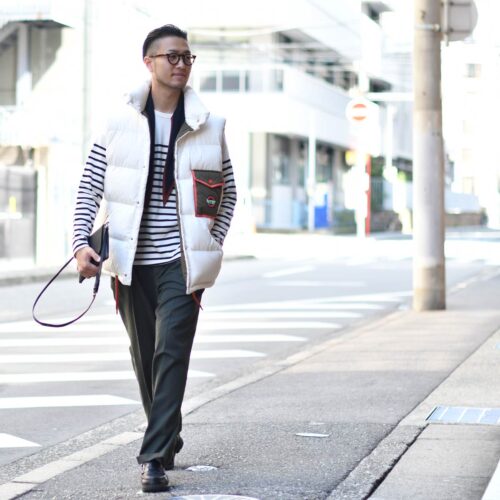 ストリートの香りがするHERNO【ヘルノ】のダウンベストを使用したコーデ。