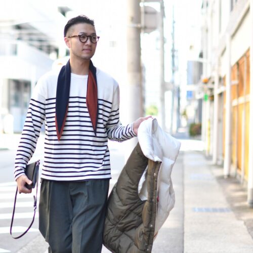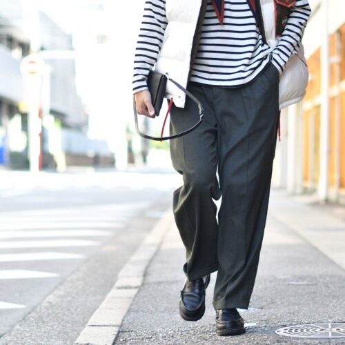 品の良いCellar Door【セラードアー】のワイドスラックスを合わせてコーディネートは完成です。