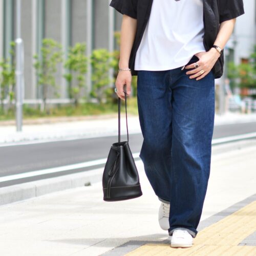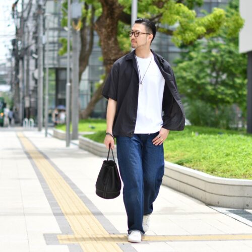 ワイドデニムを合わせて、リラックス感を強調し、