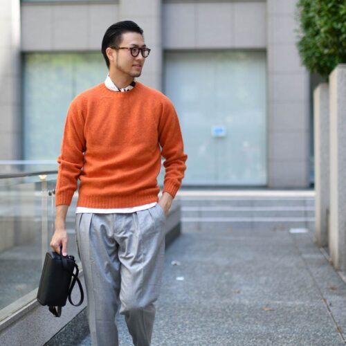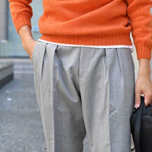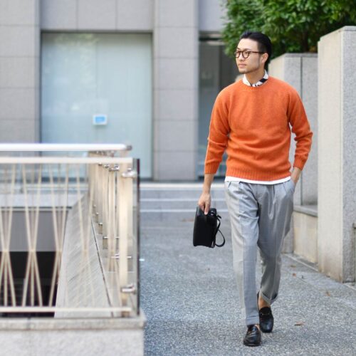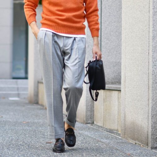 本日はライトグレーのフランネルを合わせてトラディショナルなスタイルに。